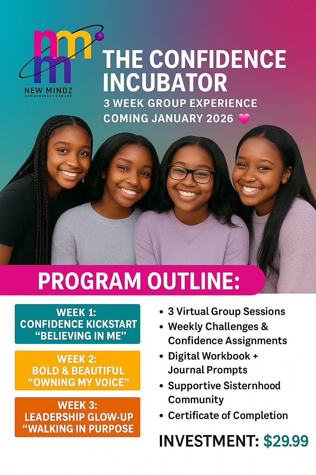 This January, weβre helping teen girls believe in themselves, own their voice, and walk boldly in purpose through The Confidence Incubator β a fun, empowering 3-week virtual experience designed to build self-esteem, leadership, and sisterhood! π